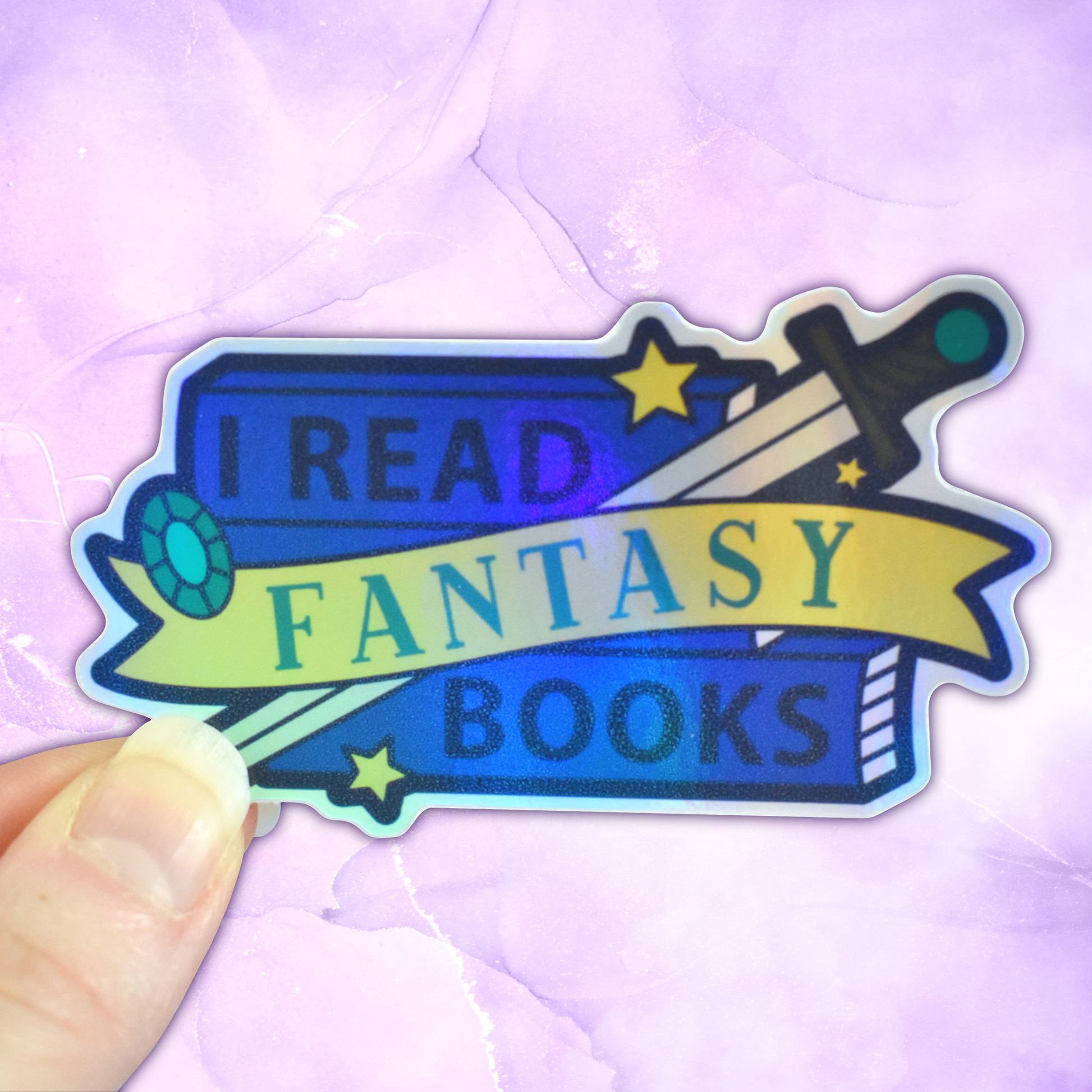 A remake of the I read fantasy books pin from the 2019 FMD 'I read...' series of enamel pins but as a bright iridescent holographic sticker!! Perfect for any fantasy lover.