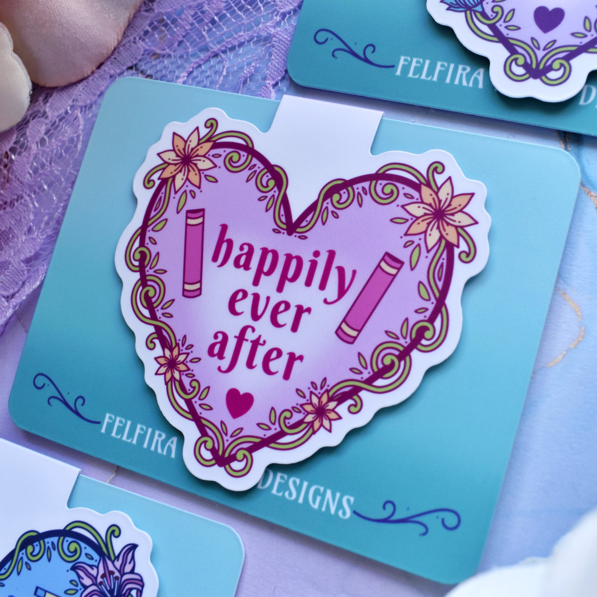 The Happily Ever After design is mostly pink with yellow stylised daisy type flowers intertwined in the outta vines. Featuring bold text and book spines on either side.